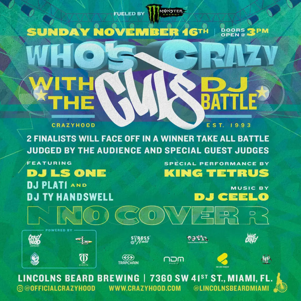 Miami’s own Crazy Hood Productions continues to cement its legacy as a cornerstone of hip-hop culture with the return of Crazy Hood Day 2025, officially recognized by Miami-Dade County and powered by Monster Energy. This year’s celebration goes down Sunday, November 16th, from 3 PM to 11 PM at Lincoln’s Beard Brewing (7360 SW 41st St, Miami, FL) — a day where music, unity, and history collide.The lineup is nothing short of legendary. Headlining the event is The Magnificent DJ Jazzy Jeff, joined by Statik Selektah delivering signature turntable mastery and flawless vibes. The night also features The Zoo Reunion, with sets from DJ Epps, DJ CoopDVille, and DJ Craze, alongside a special performance by Lastrawze — true Miami hip-hop pioneers reuniting for an unforgettable set.Performances continue with Heckler, SKAM2?, Fayn, DJ Ceelo, DJ One Track, and King Tetrus, all representing the energy and authenticity that define Crazy Hood’s movement. The event will be hosted by D-Stroy and DJ EFN, co-founder of Crazy Hood Productions and creator of the hit show Drink Champs, alongside the Crazy Hoods crew who’ve carried the torch for 32 years strong.Beyond the music, attendees can enjoy the Crazy Goods Marketplace, featuring exclusive vendors, art, merch, and local culture all under one roof. From 3 PM to 7 PM, there’s no cover, making it the perfect opportunity for fans, family, and friends to experience the essence of Miami hip-hop.Join us as we celebrate three decades of authenticity, brotherhood, and beats that built the culture.